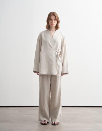 %100 Keten Çizgili Kimono Natürel
