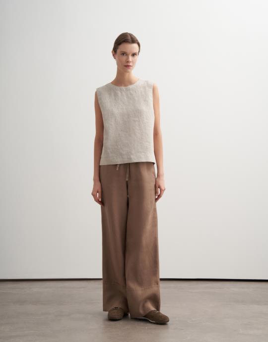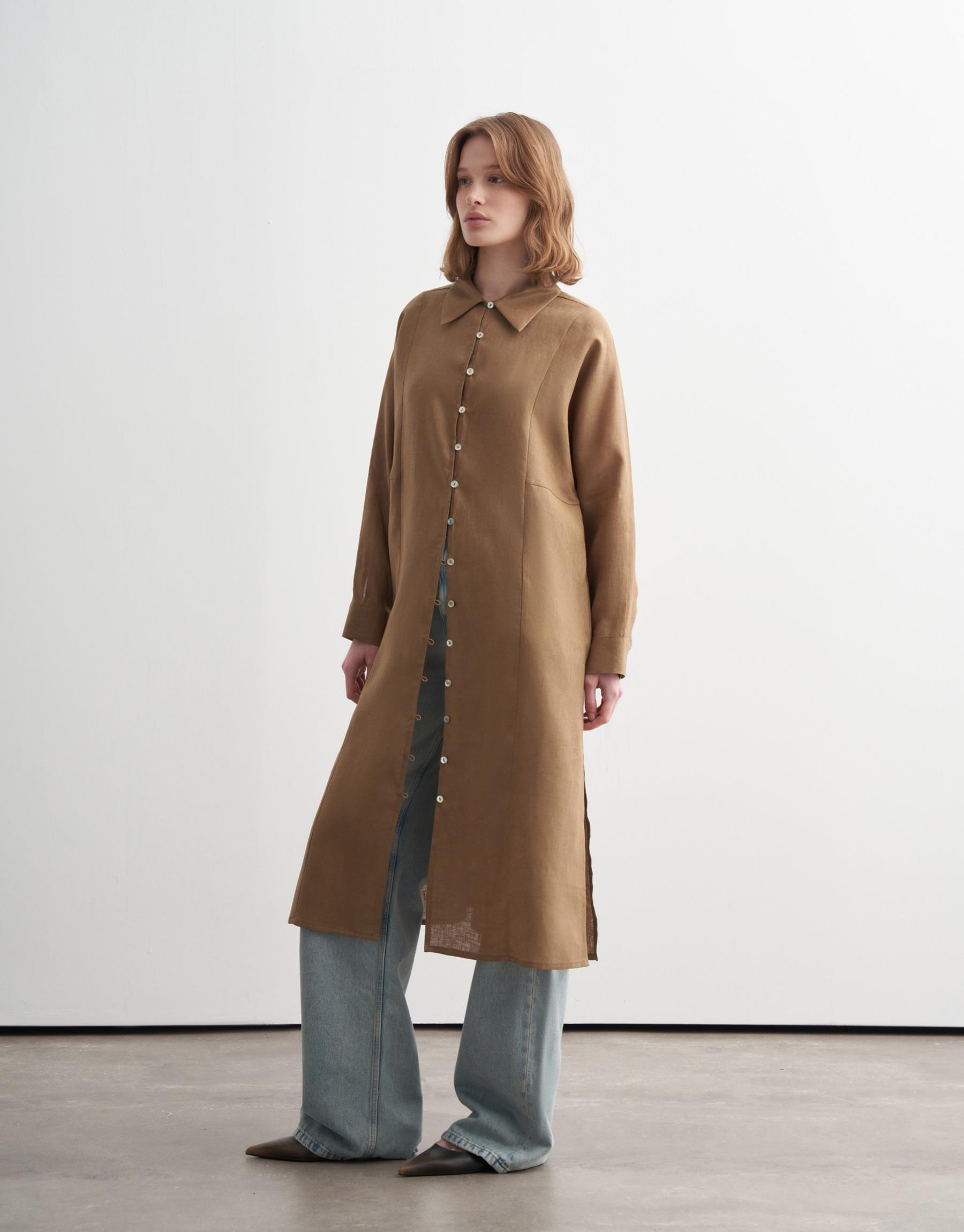 Bayan Camel %100 Keten Biritli Gömlek Elbise | KK Design