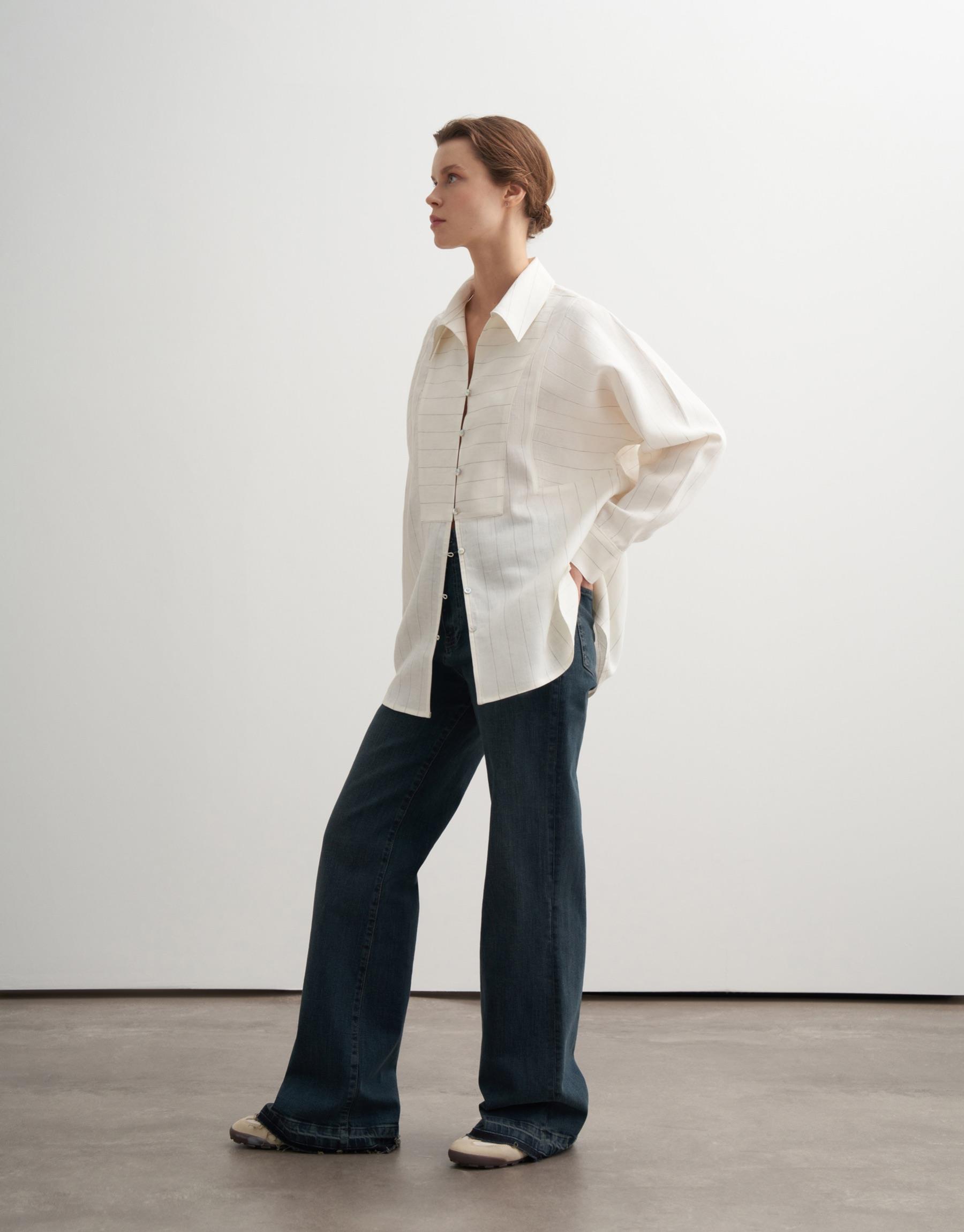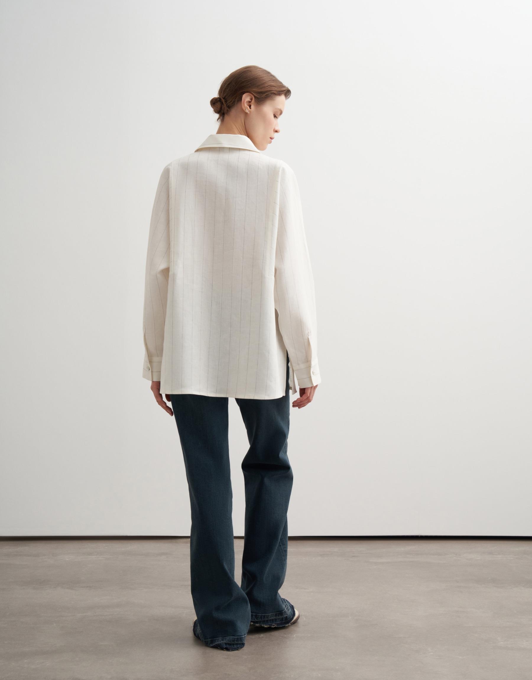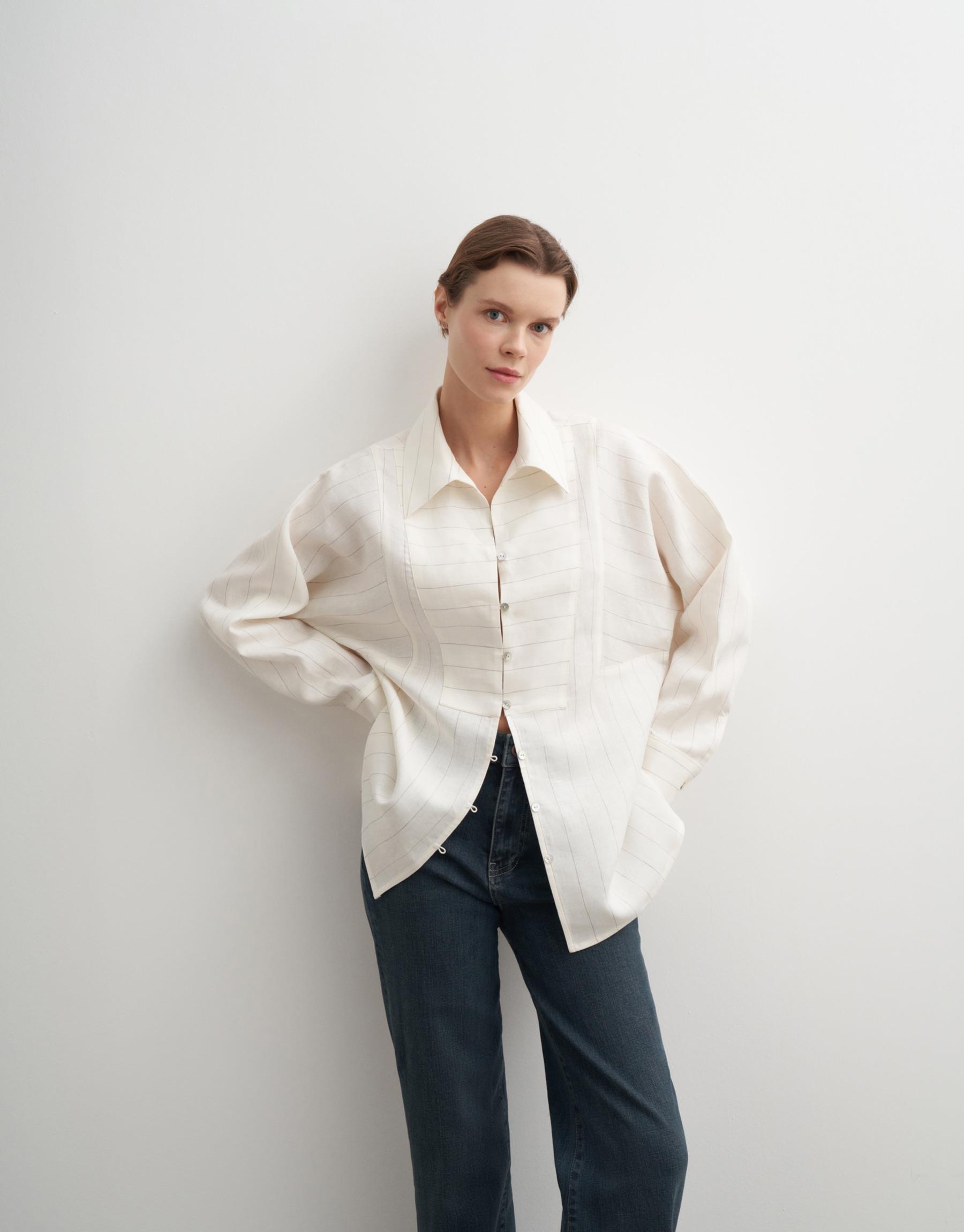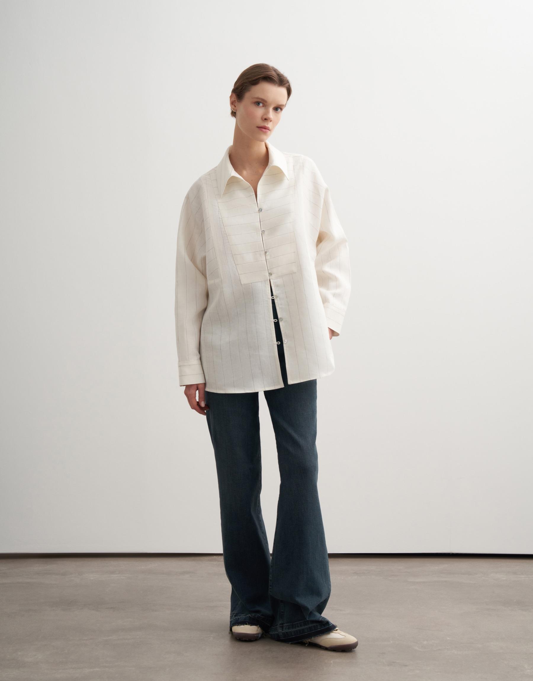 Bayan Ekru %100 Keten Çizgili Gömlek | KK Design