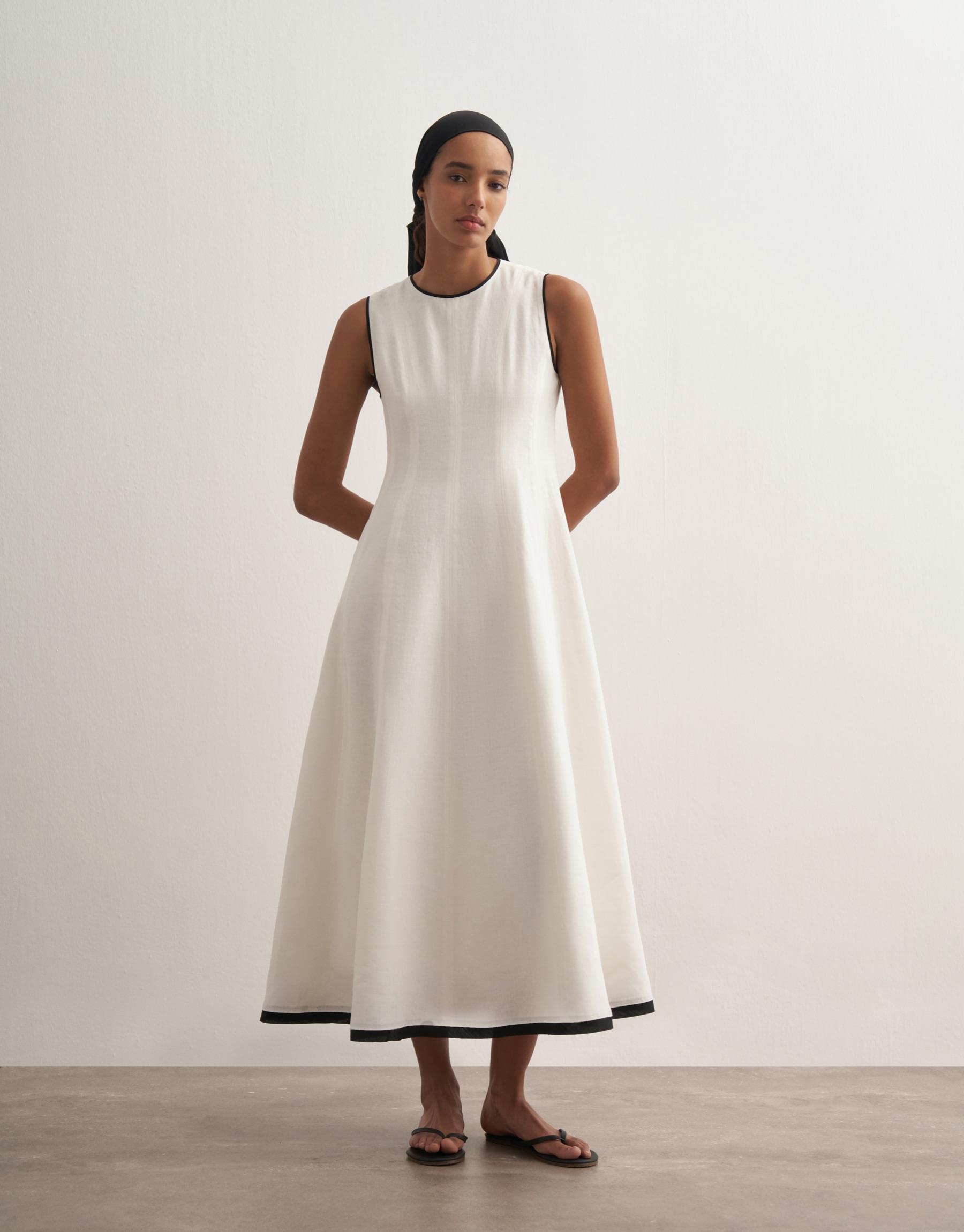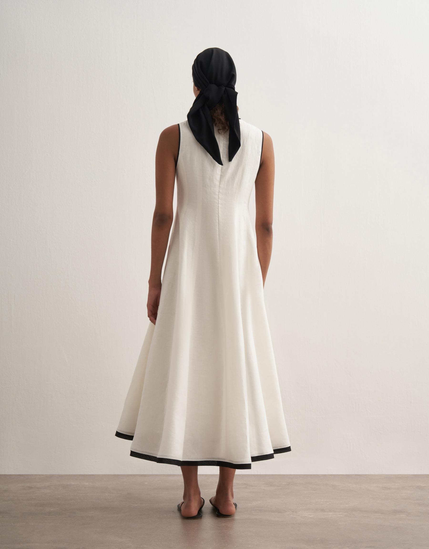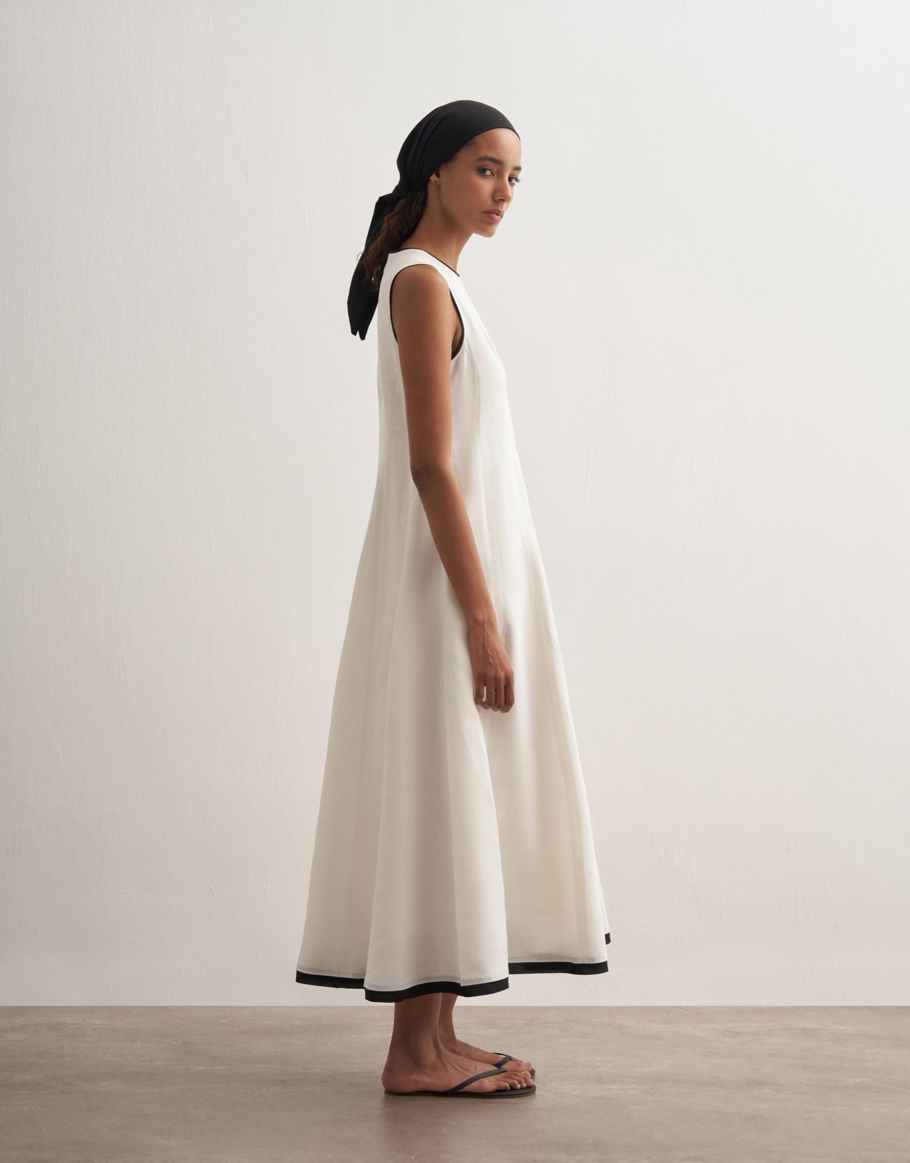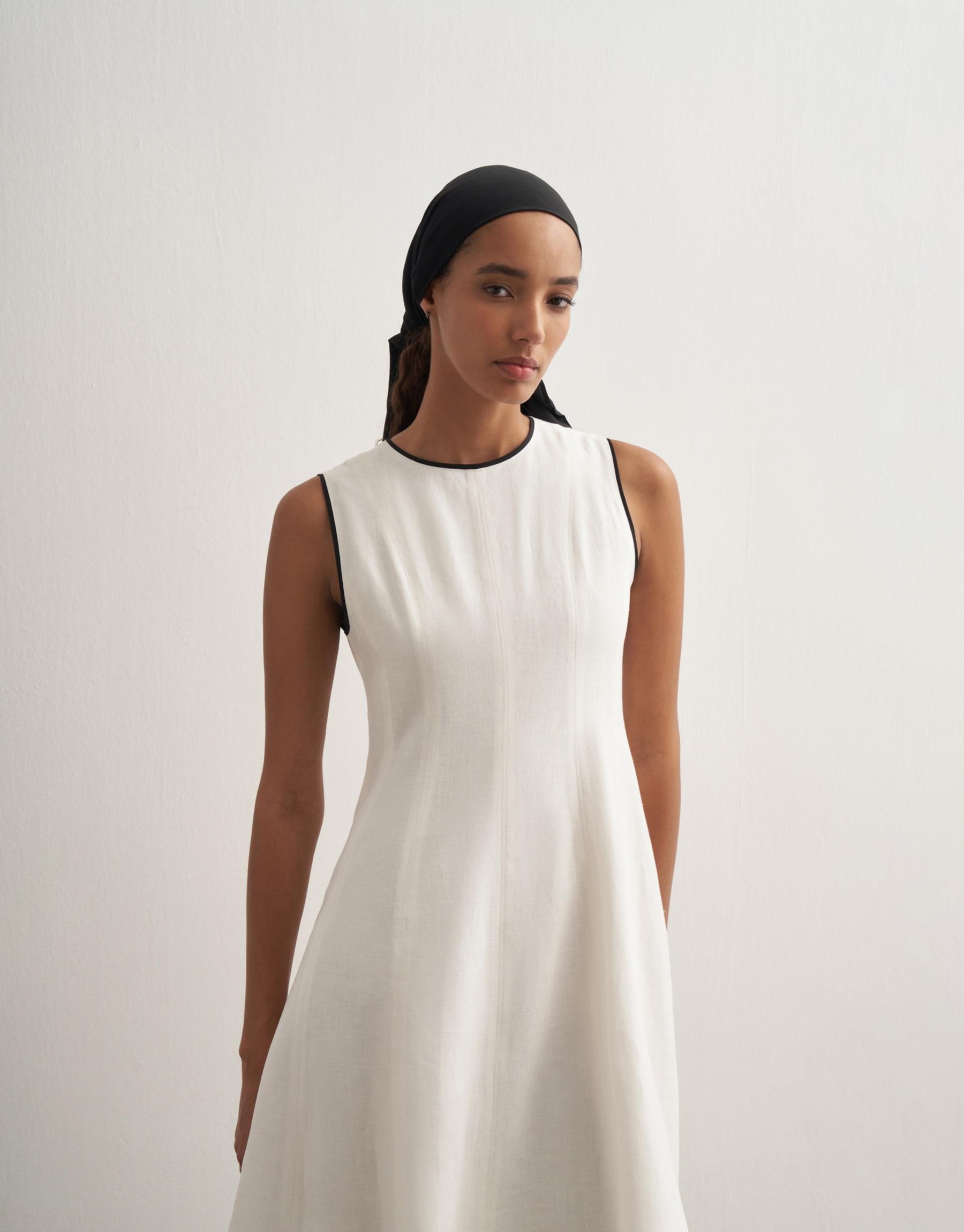 Bayan Ekru %100 Keten Kontrast Şeritli Volanlı Elbise | KK Design