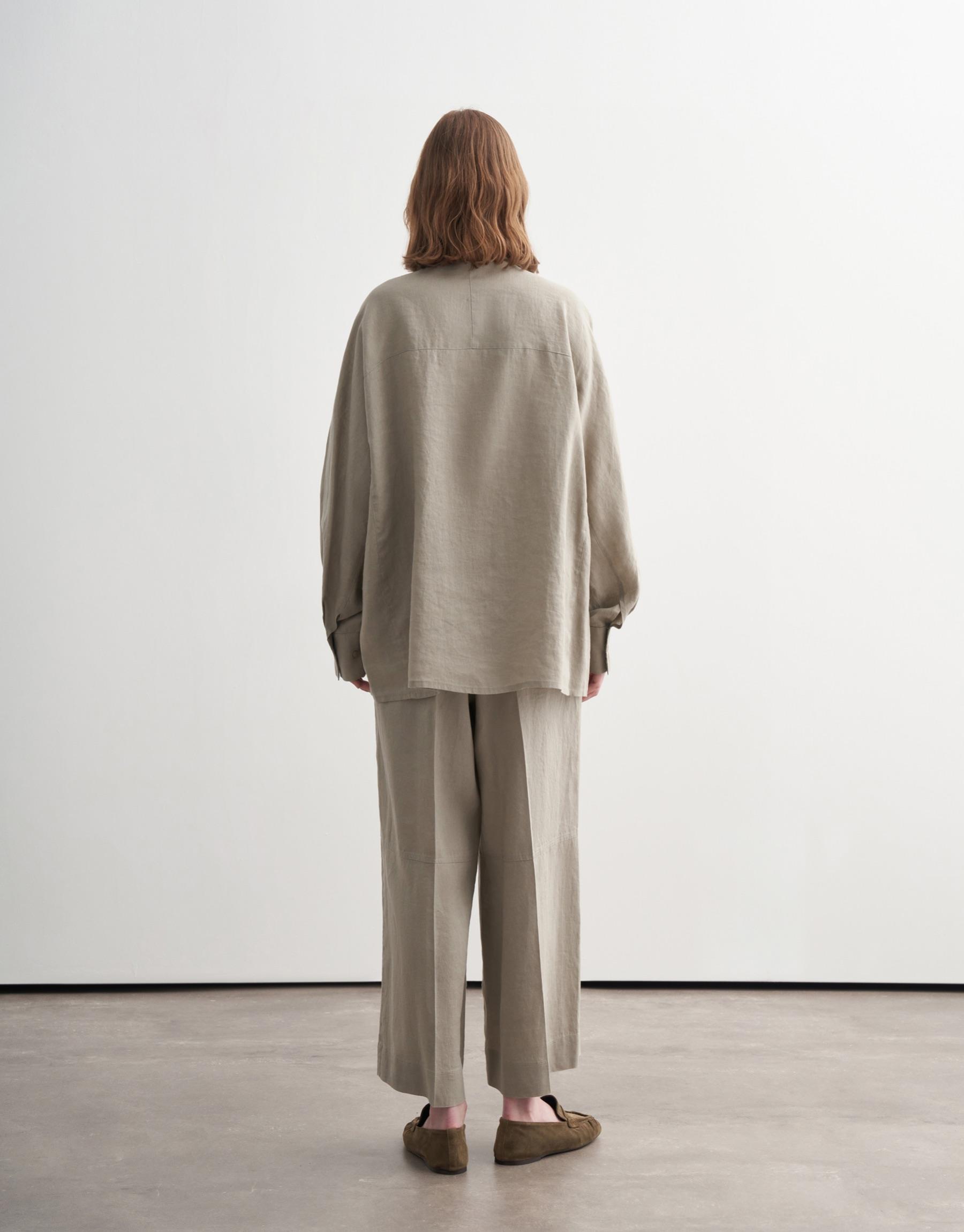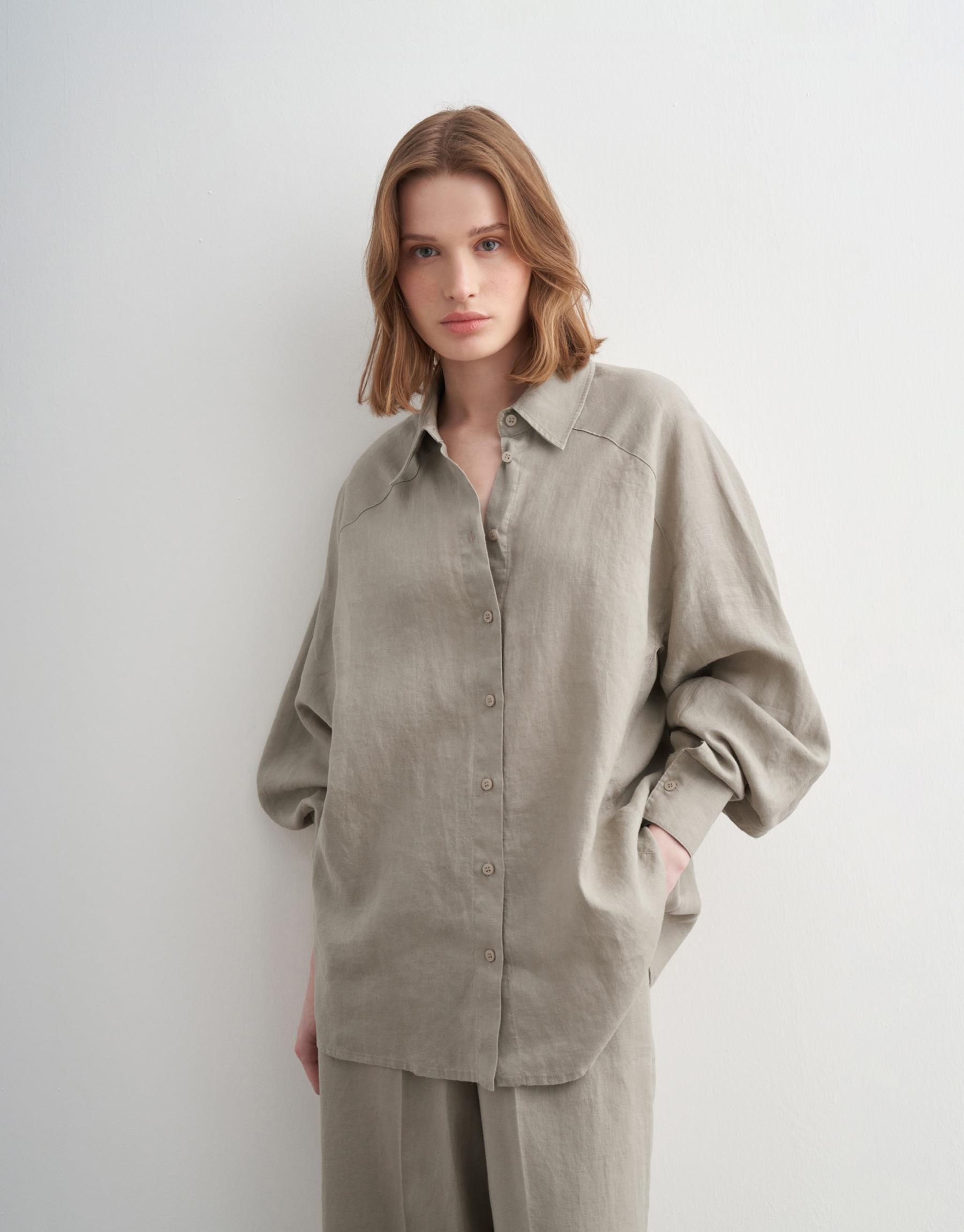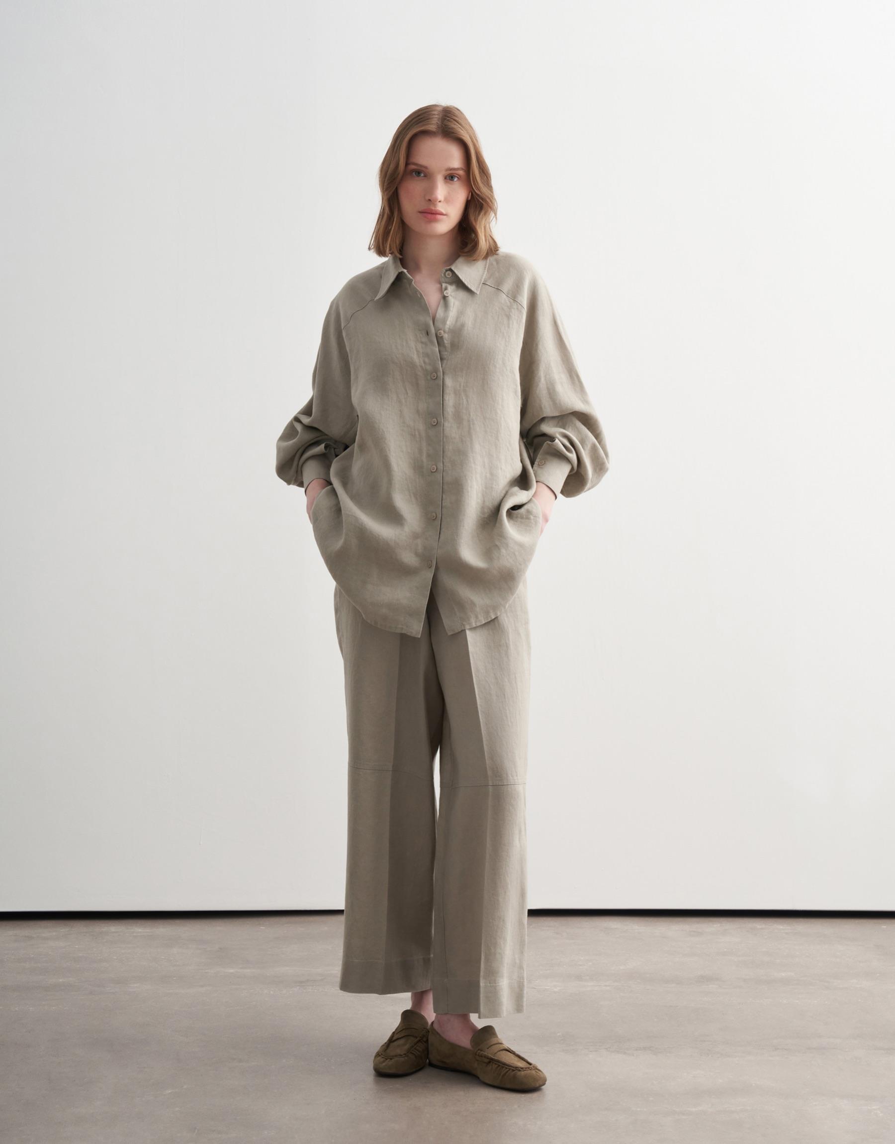 Bayan Yeşil Bej %100 Keten Manşet Detaylı Gömlek | KK Design