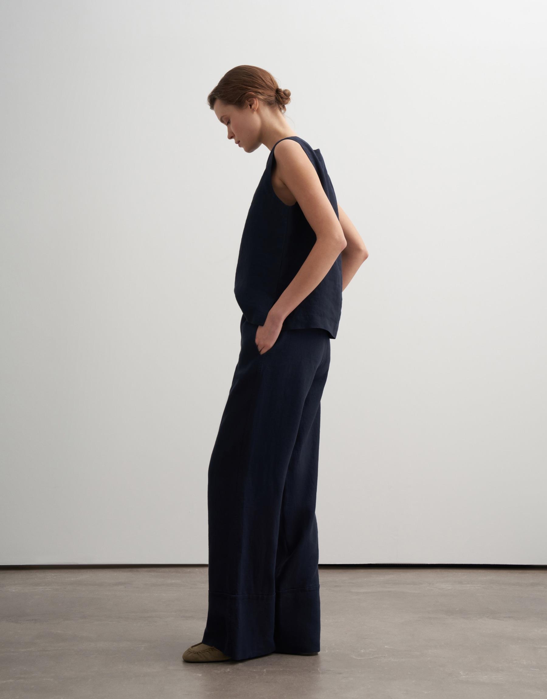 %100 Keten Palazzo Pantolon Lacivert