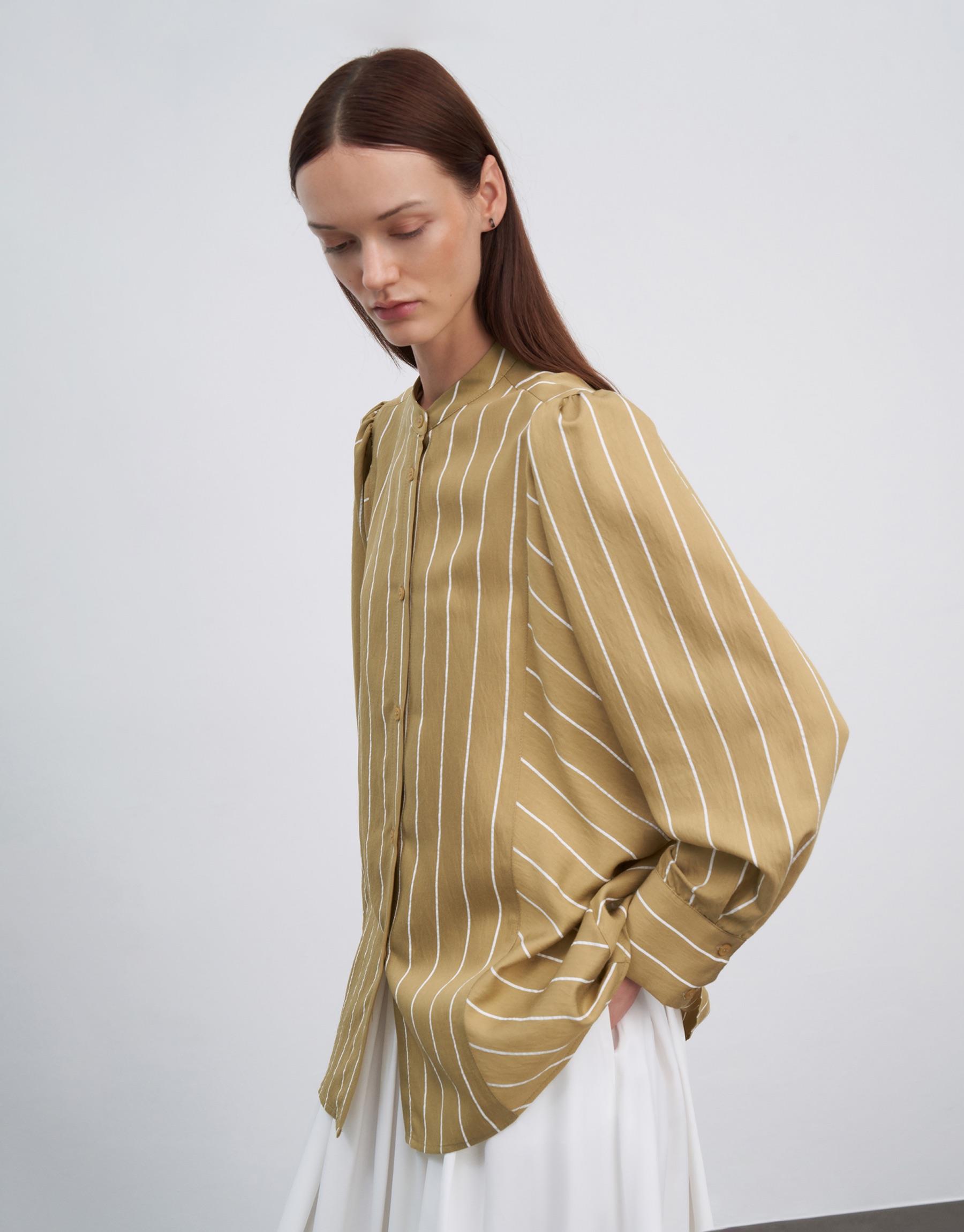 Bayan Yeşil Kol Detaylı Çizgili Gömlek | KK Design