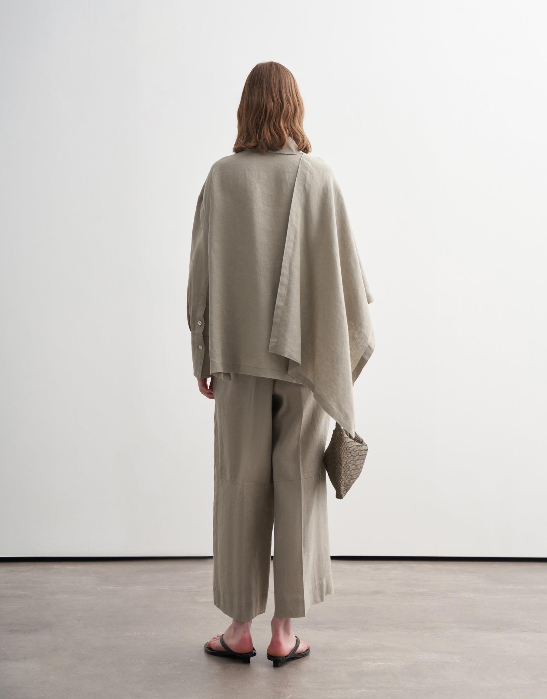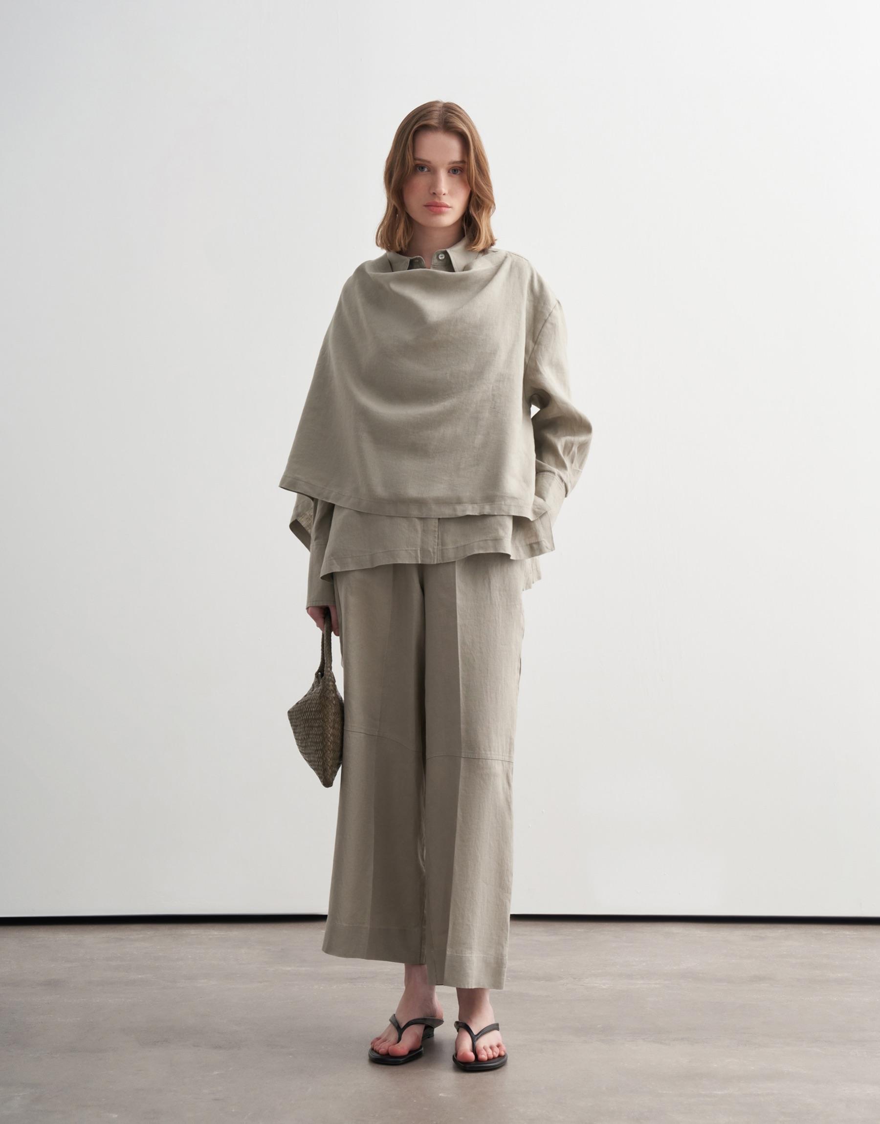 Bayan Yeşil Bej %100 Keten Şal Detaylı Gömlek | KK Design