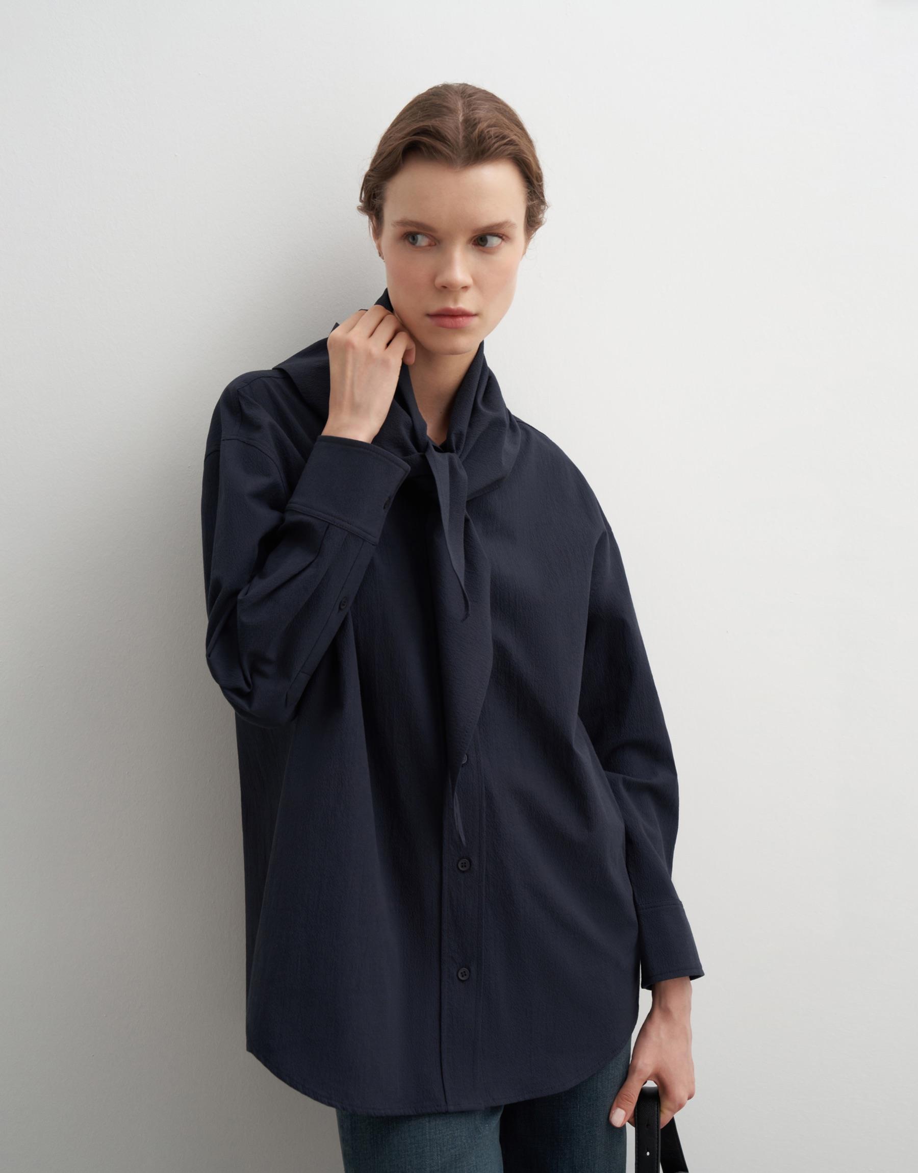 Bayan Lacivert Fularlı Dokulu Koton Gömlek | KK Design